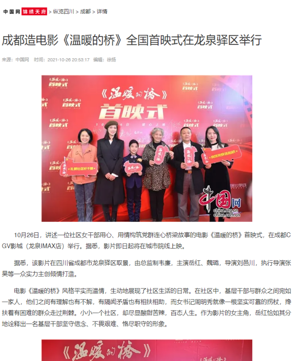 | 2 | 成都造電影《溫暖的橋》全國(guó)首映式在龍泉驛區(qū)舉行 | http://sc.china.com.cn/2021/difang/1325/1026/424065.html | 中國(guó)網(wǎng) | 網(wǎng)絡(luò) | 央媒 |