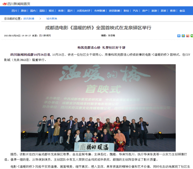 | 4 | 成都造電影《溫暖的橋》全國(guó)首映式在龍泉驛區(qū)舉行 | http://city.newssc.org/system/20211026/003213628.htm | 四川新聞網(wǎng) | 網(wǎng)絡(luò) | 省媒 |