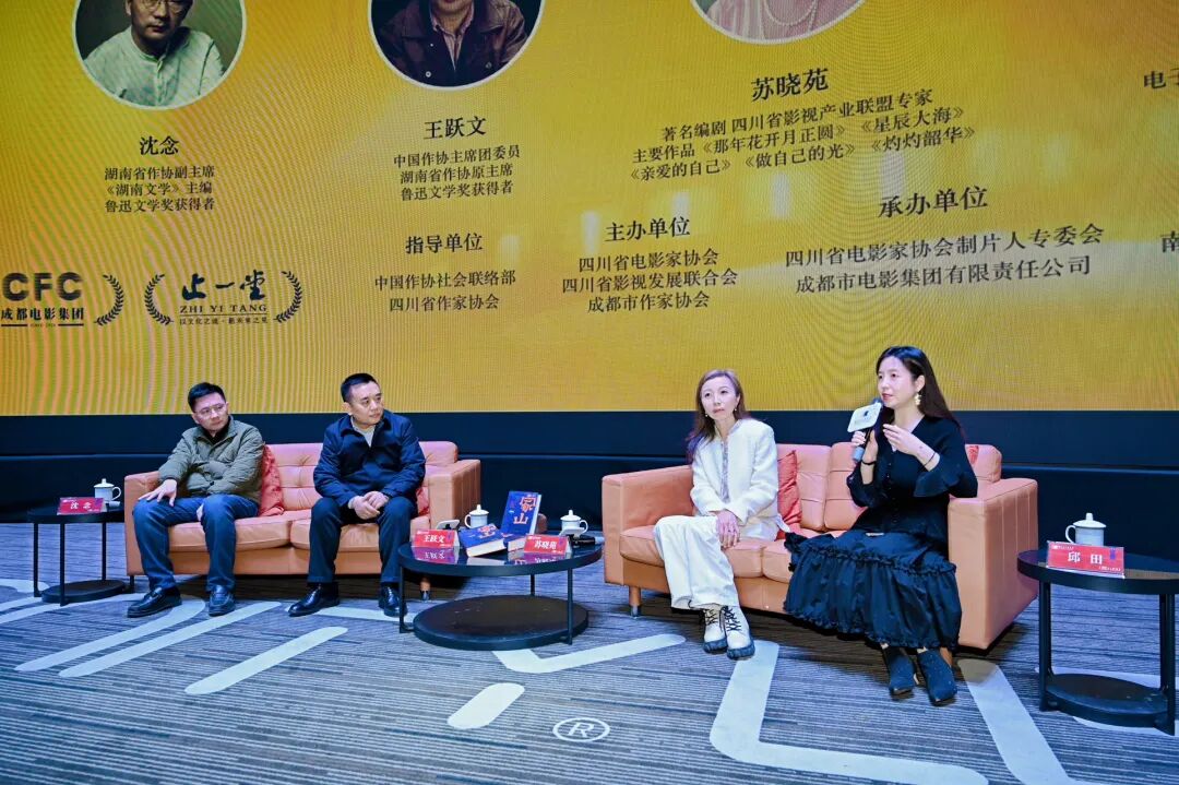 12月29日19:00,“跟著‘大家’看電影”項(xiàng)目第三期活動在成都新明電影院5號廳如期舉行,豪華的嘉賓陣容吸引了約200名觀眾參與這場文學(xué)與影視融合的文化盛宴。本次活動由中國作協(xié)主席團(tuán)委員、湖南省作協(xié)原主席、魯迅文學(xué)獎得主王躍文擔(dān)任主講嘉賓。同樣是魯迅文學(xué)獎得主,湖南省作協(xié)副主席、《湖南文學(xué)》主編沈念;擁有《那年花開月正圓》《星辰大?!贰蹲鲎约旱墓狻贰蹲谱粕厝A》等作品的著名編劇蘇曉苑擔(dān)任對談嘉賓。青年評論家、成都電子科技大學(xué)文學(xué)院副教授、文學(xué)博士邱田擔(dān)任學(xué)術(shù)主持。
